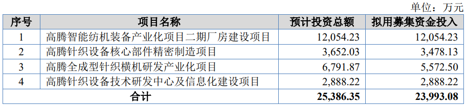 高腾机电原拟募集资金23,993.08万元,用于高腾智能纺机装备产业化项目二期厂房建设项目、高腾针织设备核心部件精密制造项目、高腾全成型针织横机研发产业化项目、高腾针织设备技术研发中心及信息化建设项目。